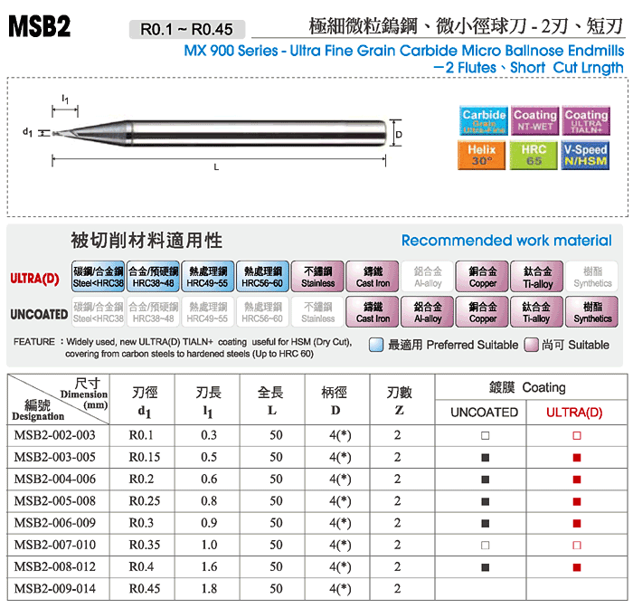 Name:MX 900 Series-Ultra Fine Grain Carbide Micro Ballnose Endmills -2 Flutes、Short Cut Lrngth