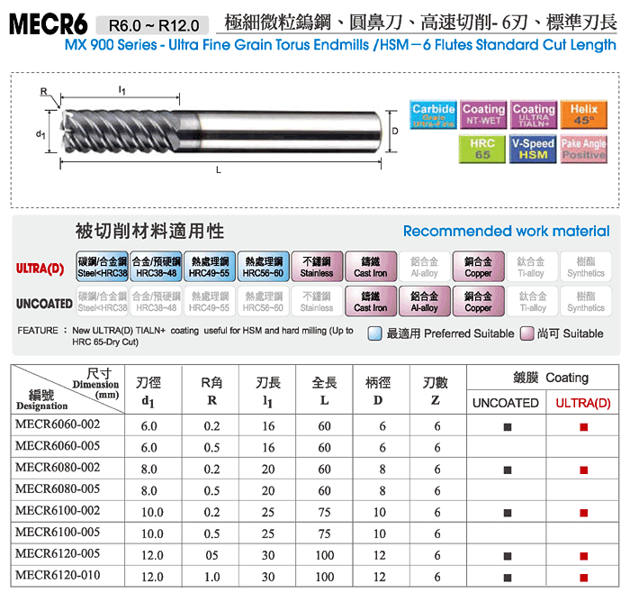 Name:MX 900 Series-Ultra Fine Grain Carbide Torus Endmills / HSM-6 Flutes Standard Cut Length