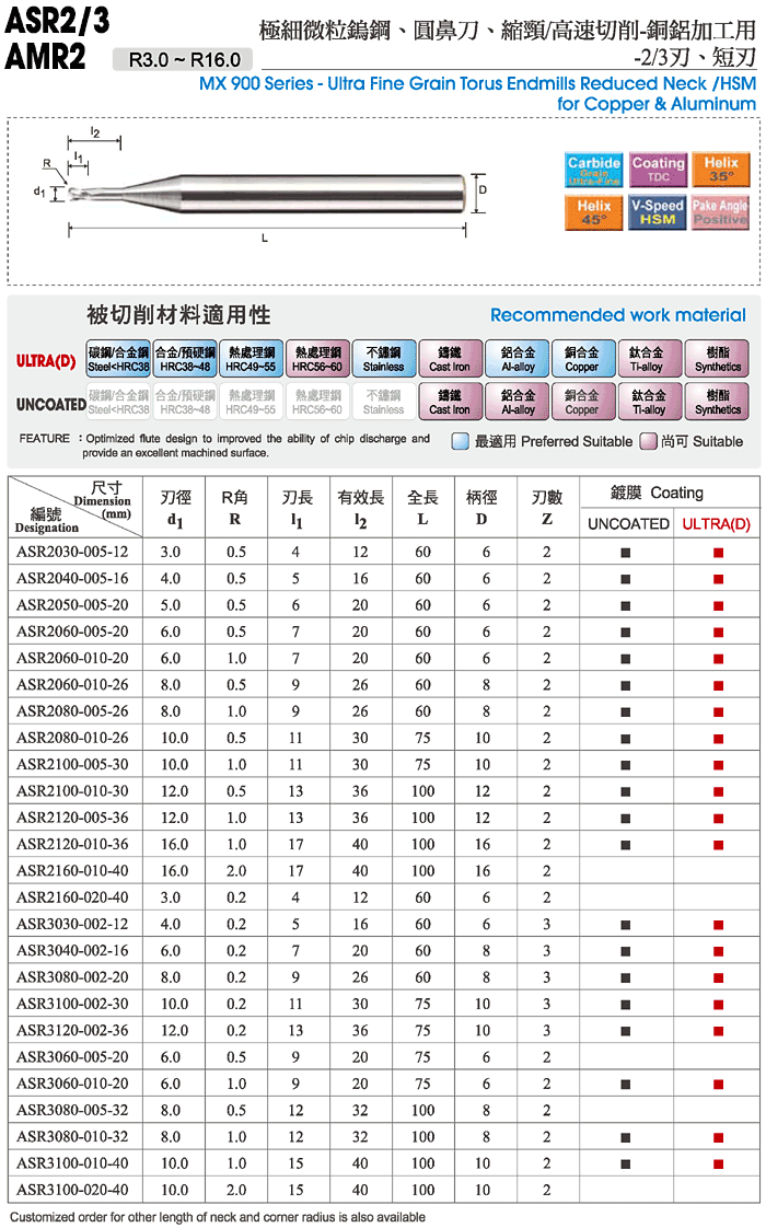 Name:MX 900 Series-Ultra Fine Grain Carbide Torus Endmills Reduced Neck /HSM for Copper & Aluminum