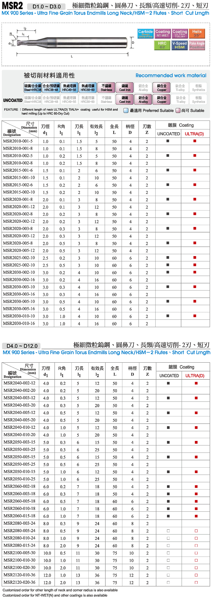 Name:MX 900 Series-Ultra Fine Grain Carbide Torus Endmills Long Neck /HSM 2 Flutes 、 Short Cut Lrngth