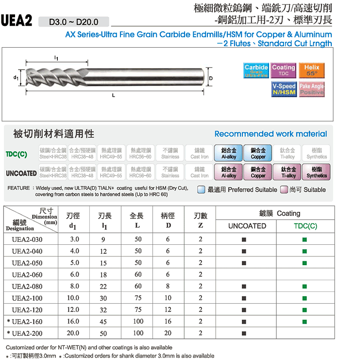 Name:Carbide endmills / HSM for copper & Aluminum - 2 Flutes , Standard Cut Length