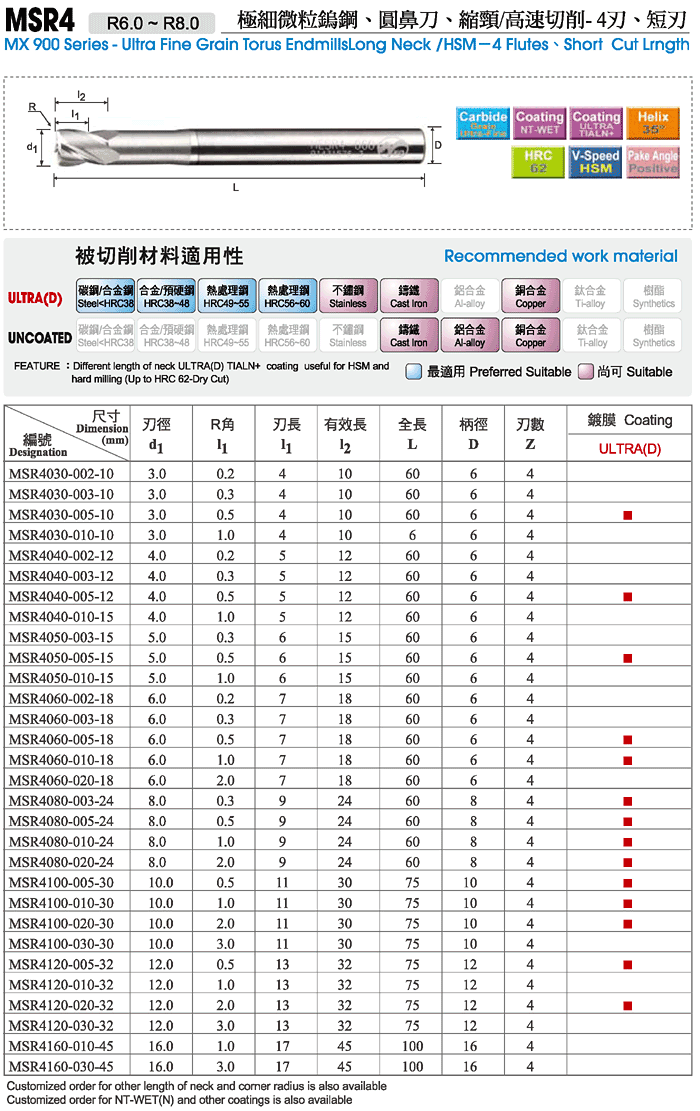 Name:MX 900 Series-Ultra Fine Grain Carbide Torus Endmills Long Neck /HSM 4 Flutes 、 Short Cut Lrngth